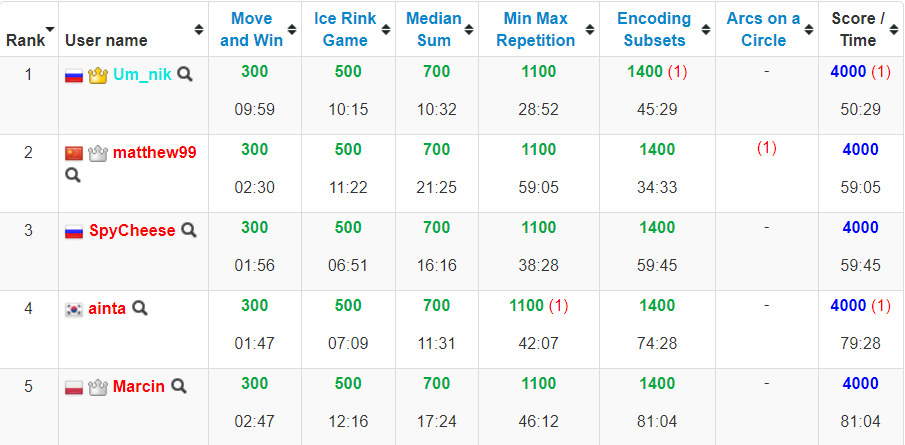 I've also just realized that I forgot to cover the previous SRM, TopCoder SRM 727 which took place two weeks ago very early in the morning (problems, results, top 5 on the left, analysis). lych_cys, participating in Division 1 for the first time, has squeezed the victory during the challenge phase from wxh010910, who was doing only his third Division 1 round himself, while the rest of the pack was more than 100 points behind. Congratulations to the winning newcomers!